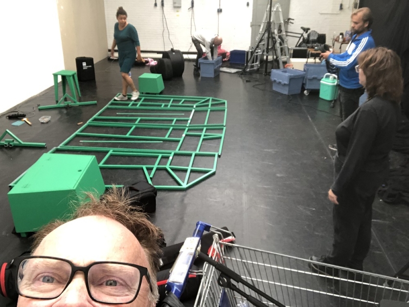 Regisseur Tony Minnema kijkt in blauw trainingsjack graag toe bij het afbreken van het decor.