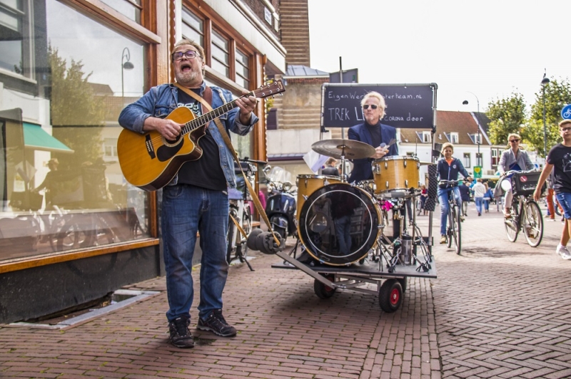 HAARLEM - Een opmerkelijk beeld in het centrum van Haarlem. Een karretje met daarop een drummer, voortgetrokken door iemand die een gitaar bespeelt, reed door de Haarlemse straten. De muzikanten speelden vrolijke wijsjes en dat bleef niet onopgemerkt bij het winkelende publiek.